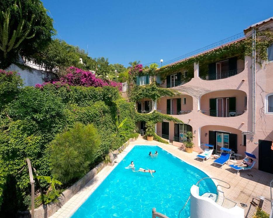 Settimanalmente serata con musica. Hall con reception h24, internet point ad accesso libero e Wi-Fi gratuito in tutta la struttura; ascensore, bar e tavernetta. 2 piscine termominerali, di cui una coperta “Iris” ed una esterna Fonte “Grannos”, con idromassaggio, solarium attrezzato e terrazze elioterapiche con vista panoramica sul golfo di Napoli. Servizio navetta da/per il centro e la spiaggia ad orari prestabiliti. Su richiesta e a pagamento: possibilità di noleggio accappatoio, servizio baby sitting e servizio lavanderia. Parcheggio comunale, non custodito ed a pagamento a ca. 10 m. Animali ammessi di piccola taglia (escluse aree comuni).